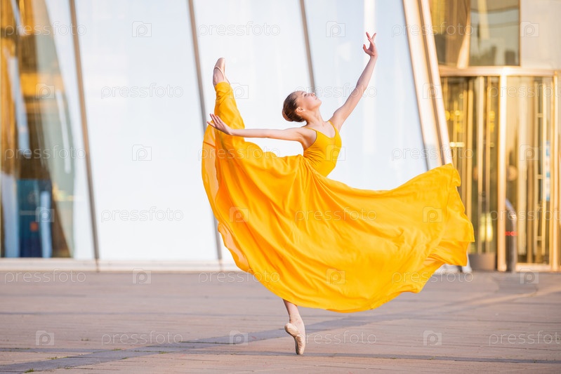 Молодая балерина в длинном летящем желтом платье танцует на фоне городского пейзажа