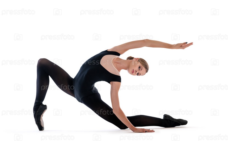 Молодая балерина в черных пуантах и трико позирует в изящной позе, изолированная на белом фоне