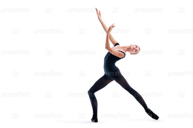 Молодая балерина в черных пуантах и трико позирует в изящной позе, изолированная на белом фоне