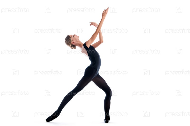 Молодая балерина в черных пуантах и трико позирует в изящной позе, изолированная на белом фоне