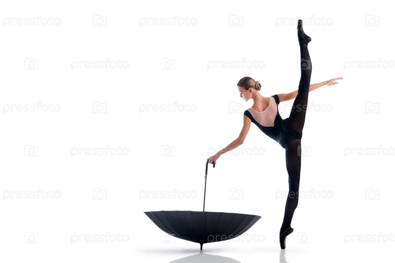 Молодая балерина в черных пуантах и купальнике позирует с зонтиком в изящной позе на белом фоне