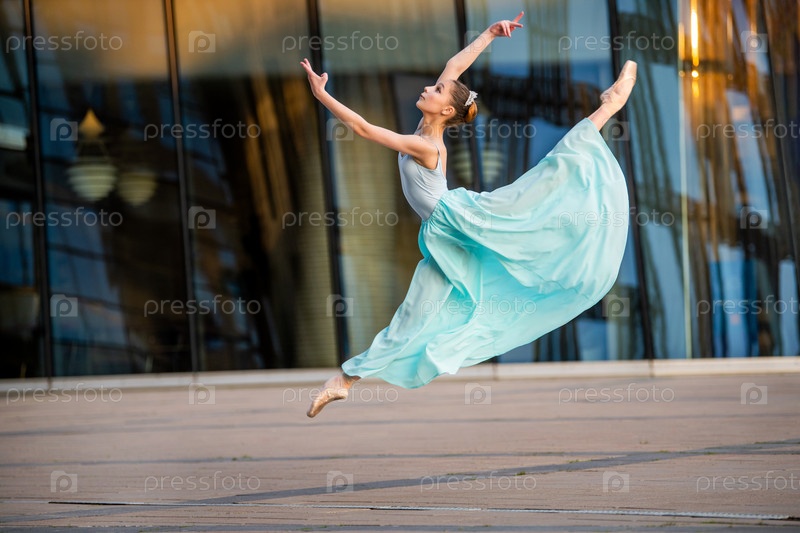 Юная балерина в белом трико танцует на пуантах на фоне городского пейзажа, застыла в прыжке