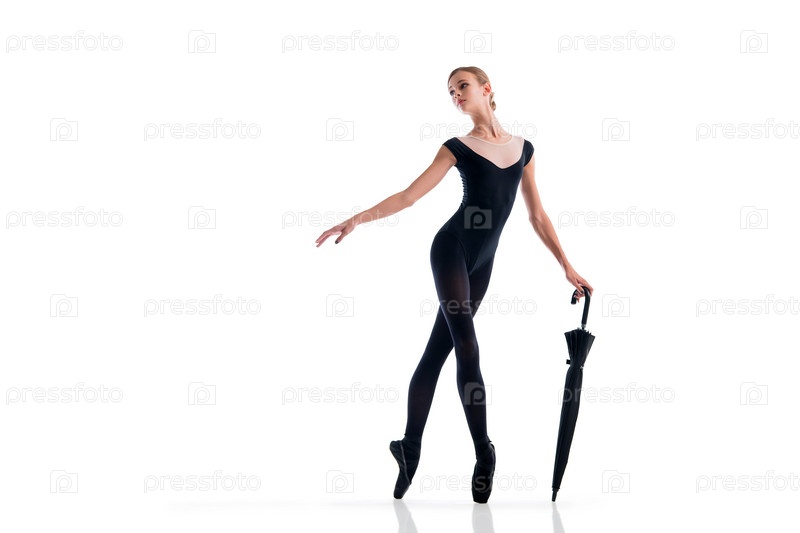 Молодая балерина в черных пуантах и купальнике позирует с зонтиком в изящной позе на белом фоне