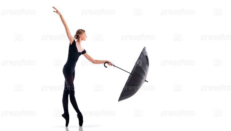 Молодая балерина в черных пуантах и купальнике позирует с зонтиком в изящной позе на белом фоне