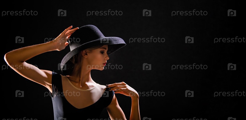 Романтический портрет красивой молодой девушки на черном фоне в элегантной шляпе