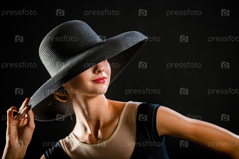 Романтический портрет красивой молодой девушки на черном фоне в элегантной шляпе