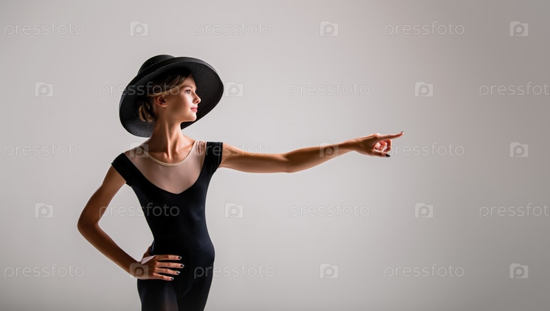 Романтический портрет красивой молодой девушки на светлом фоне в элегантной шляпе, указывающей вправо
