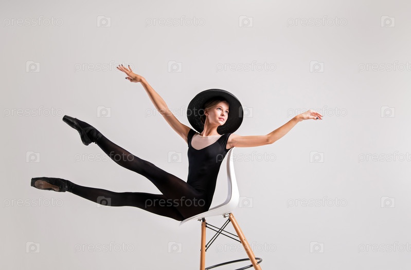 Молодая балерина в черных пуантах и элегантной шляпе летит вместе со стулом на сером фоне