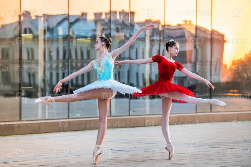Две молодые балерины в ярко-красной и синей пачке танцуют на фоне отражения городского заката