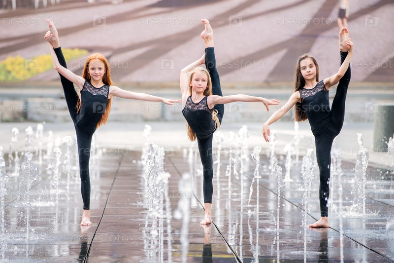 Группа из трех маленьких балерин в черных обтягивающих костюмах танцует на фоне городских фонтанов в жаркий день