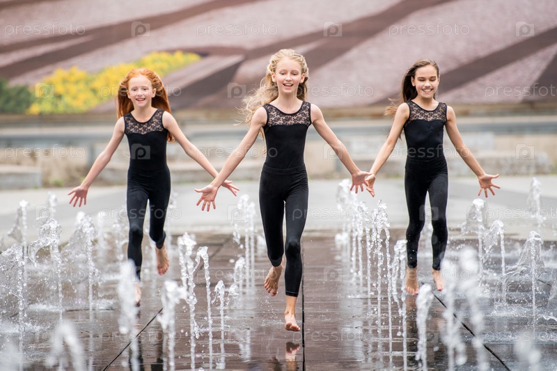 Группа из трех маленьких балерин в черных облегающих костюмах бежит к зрителю среди брызг фонтанов на фоне городского пейзажа в жаркий день