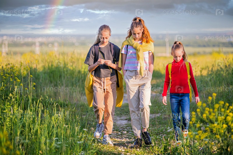 Группа девушек, гуляющих на природе с рюкзаками на фоне заката, активный здоровый образ жизни