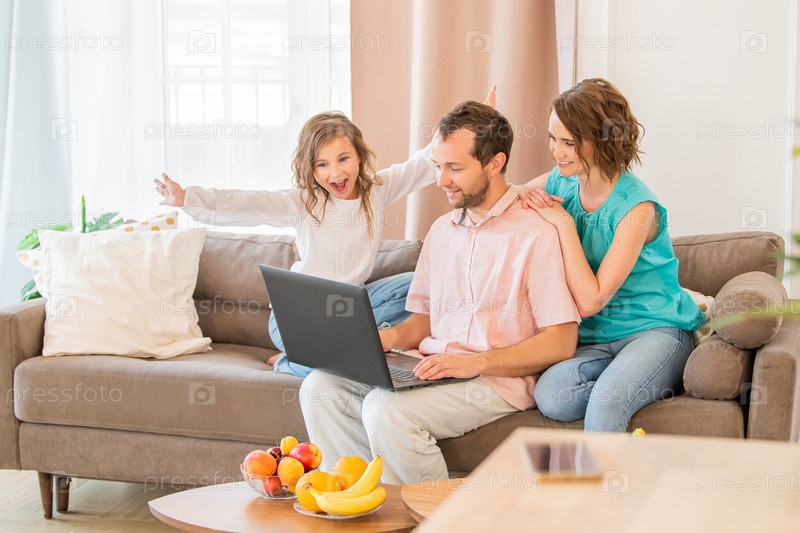 Счастливая семья, мама, папа и дочь сидят на диване и вместе смотрят на монитор ноутбука