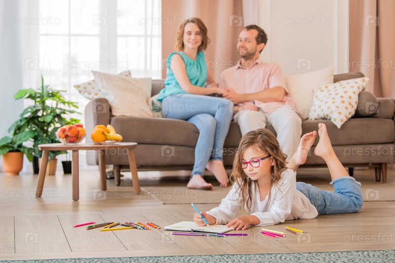 Девушка рисует цветными карандашами, лежащими на полу дома. На заднем плане сидят счастливые родители