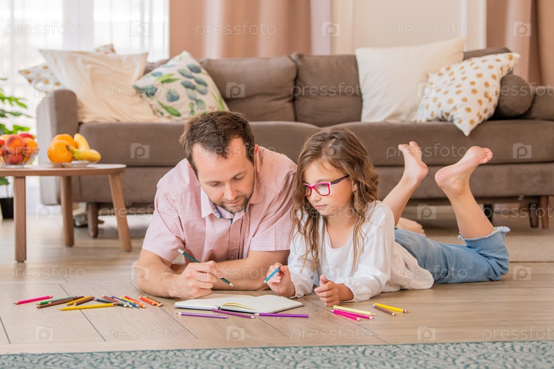 Отец и дочь в очках рисуют вместе, лежа на полу в квартире