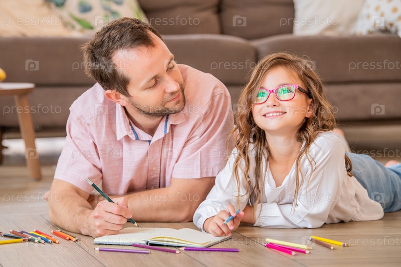Отец и дочь в очках рисуют вместе, лежа на полу в квартире