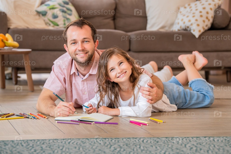 Отец и дочь рисуют вместе, лежа на полу в квартире