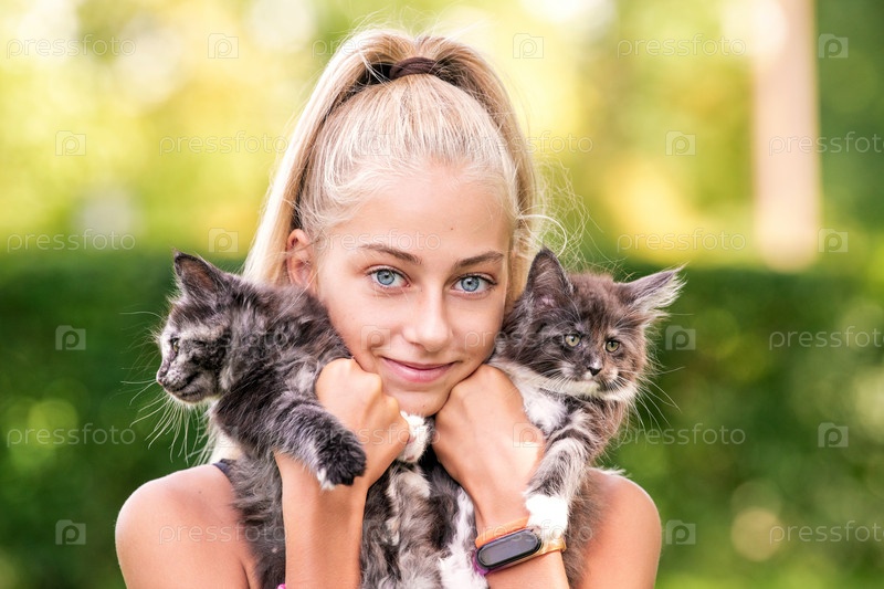 Портрет очаровательной голубоглазой девочки-подростка, играющей с маленькими котятами в теплый и солнечный летний день