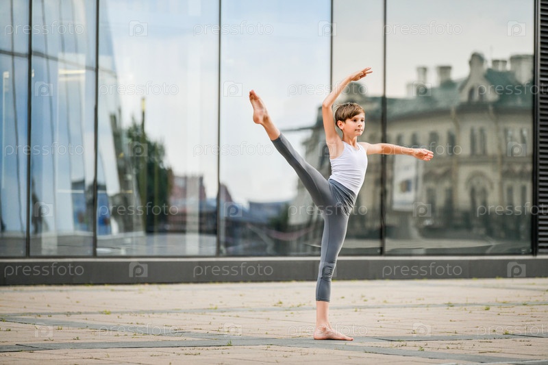 Балет мальчик подросток танцует на фоне отражения города и неба в стеклянной стене