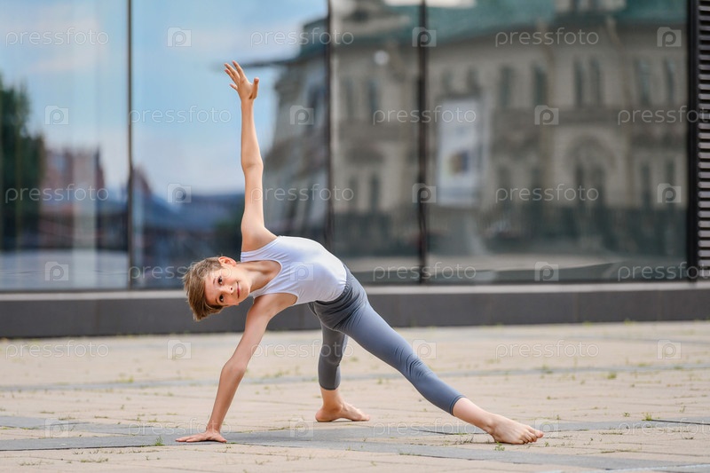 Балет мальчик подросток тренируется стоя на руках на фоне отражения города и неба в стеклянной стене