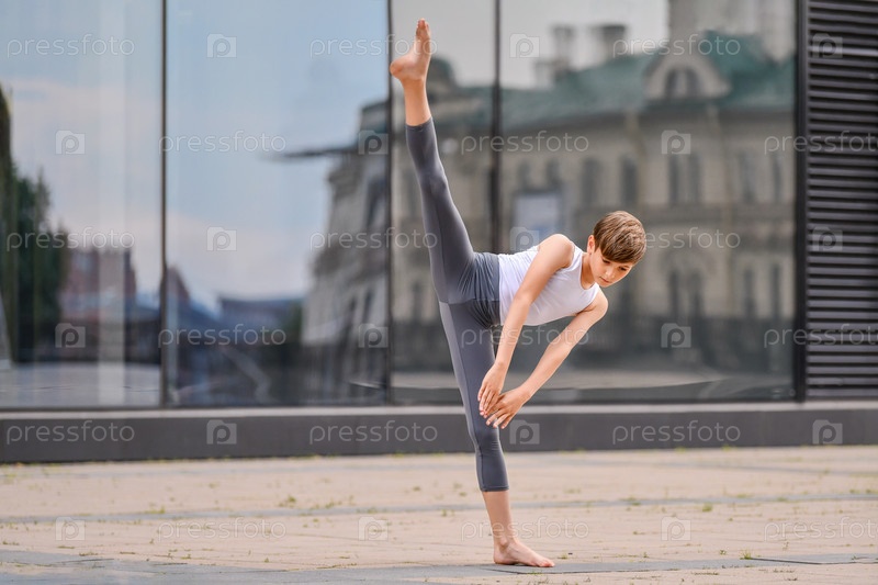 Балет мальчик подросток тренируется стоя на руках на фоне отражения города и неба в стеклянной стене