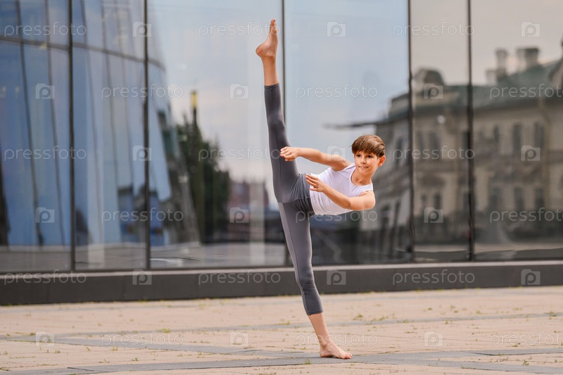 Балет мальчик подросток танцует на фоне отражения города и неба в стеклянной стене