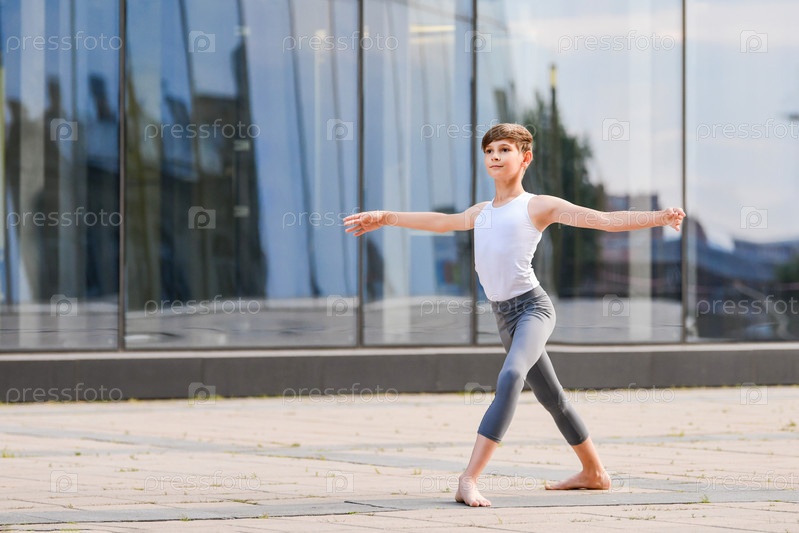 Балет мальчик подросток танцует на фоне отражения города и неба в стеклянной стене