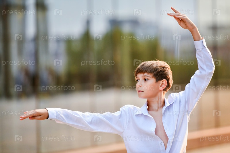 Портрет балетного мальчика на фоне отражения города в стеклянной стене