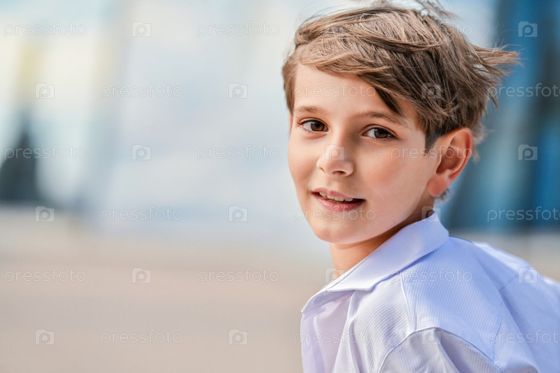 Портрет счастливого мальчика в расстегнутой рубашке на фоне летнего неба