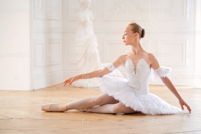 Юная стройная балерина в белой пачке в пуантах сидит в изящной позе на полу в большом красивом белом зале