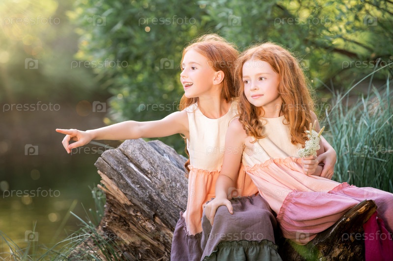 Две рыжеволосые сестры в длинных льняных платьях отдыхают на озере в парке в солнечный летний день. Одна девушка указывает рукой в сторону озера