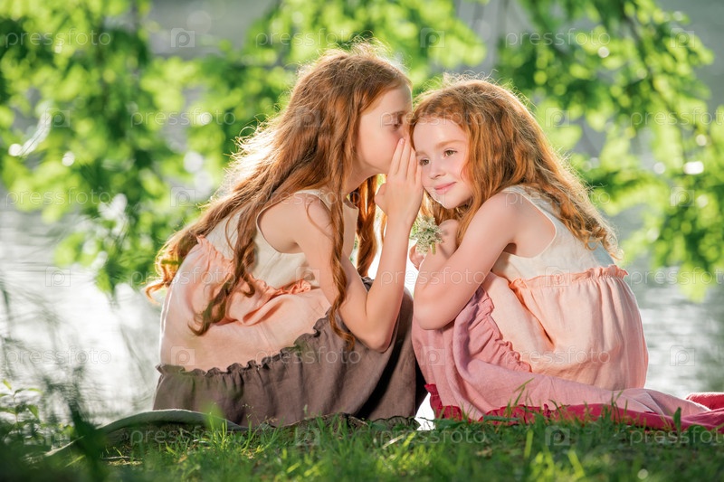 Две рыжеволосые сестры в длинных льняных платьях отдыхают на озере в парке в солнечный летний день