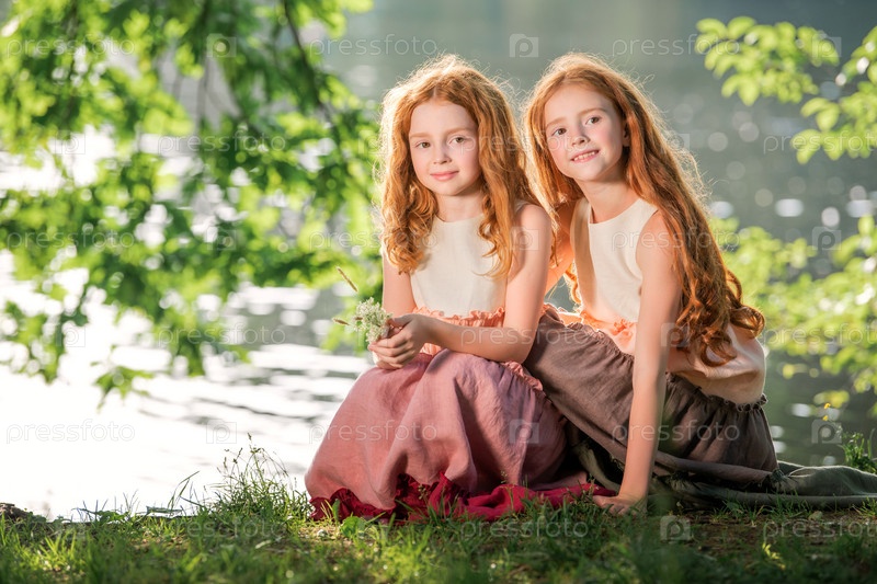 Две рыжеволосые сестры в длинных льняных платьях отдыхают на озере в парке в солнечный летний день