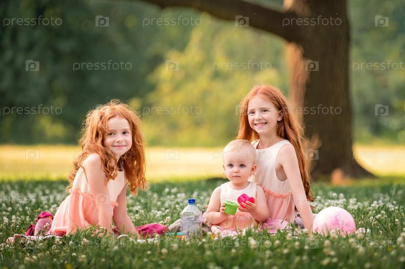 Три рыжеволосых кудрявых счастливых сестры играют в пикник на траве среди цветов белого клевера
