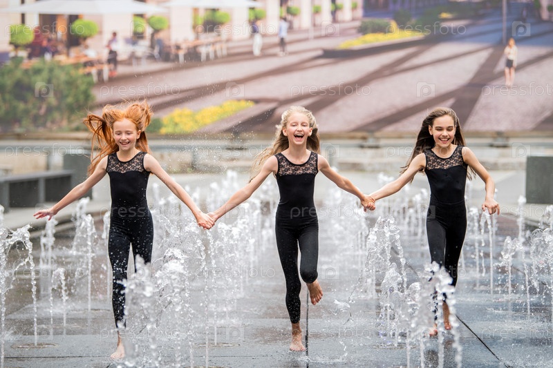 Группа из трех маленьких балерин в черных обтягивающих костюмах бежит к зрителю среди плескающихся фонтанов