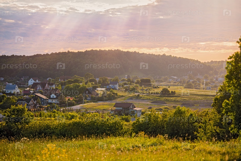 Панорамный вид с горы на небольшой сельский поселок среди полей и лесов на закате летом
