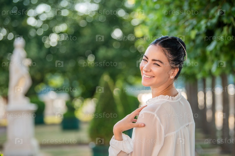 Крупным планом портрет молодой романтической женщины, гуляющей в парке