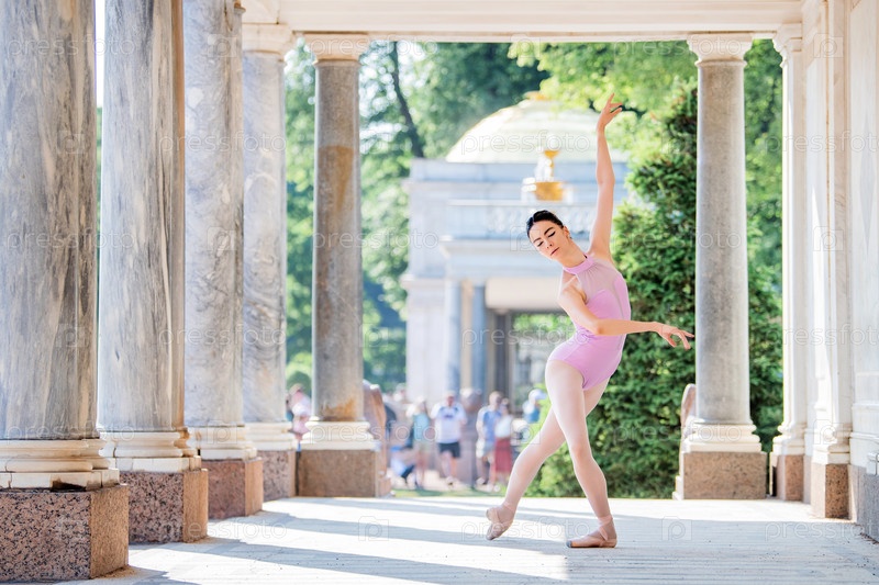 Стройная балерина в пуантах и силуэтном костюме танцует на фоне античной архитектуры в парке