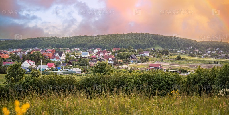 Панорамный вид с горы на небольшой сельский поселок среди полей и лесов на закате летом