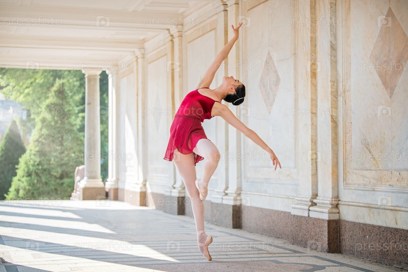 Стройная балерина в пуантах и силуэтном костюме танцует на фоне античной архитектуры в парке