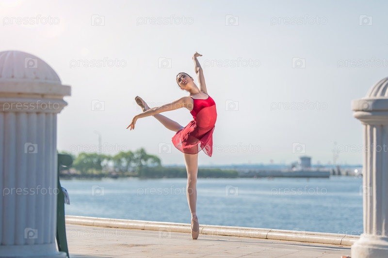 Стройная балерина в пуантах и свадебном костюме прыгает на фоне моря