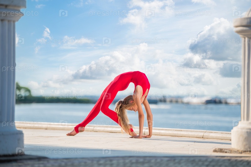 Гимнастка-подросток в красном костюме позирует на набережной на фоне моря и неба