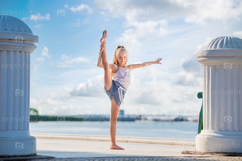 Гимнастка очаровательная блондинка позирует на набережной на фоне моря и неба