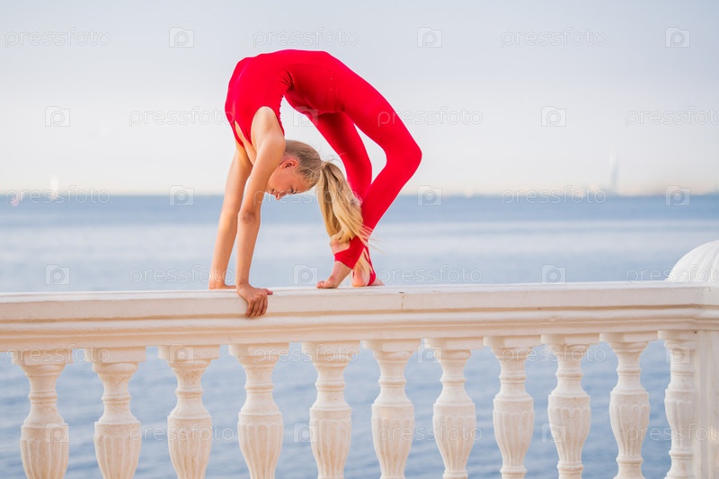 Гимнастка-подросток в красном костюме позирует на набережной на фоне моря и неба