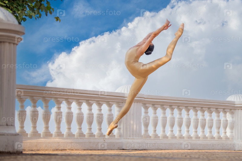 Стройная балерина в пуантах и свадебном костюме прыгает на фоне моря