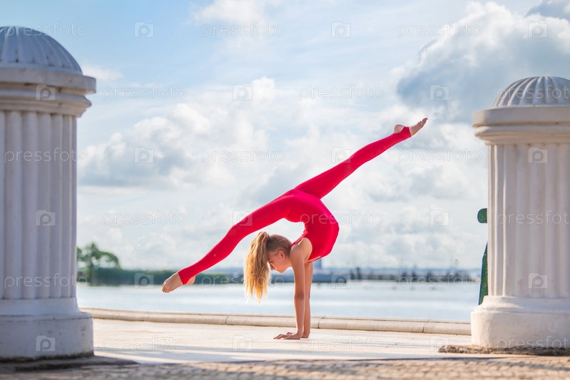 Гимнастка-подросток в красном костюме позирует на набережной на фоне моря и неба