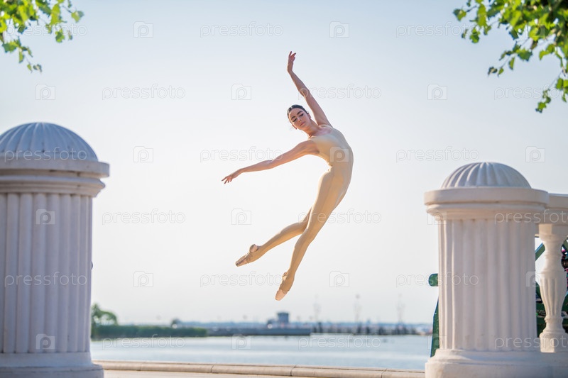 Стройная балерина в пуантах и свадебном костюме прыгает на фоне моря