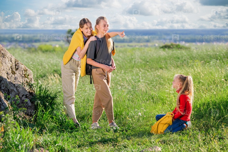 Дети с рюкзаками в походе в летнюю поездку на природу. Группа девочек-подростков наслаждается прогулкой