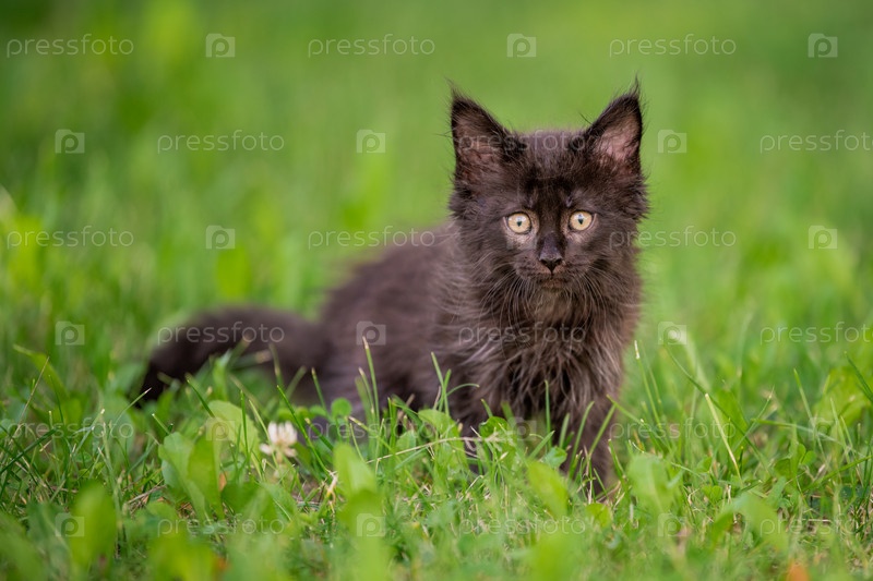 Маленький пушистый игривый черный котенок Мейн Кун гуляет по зеленой траве