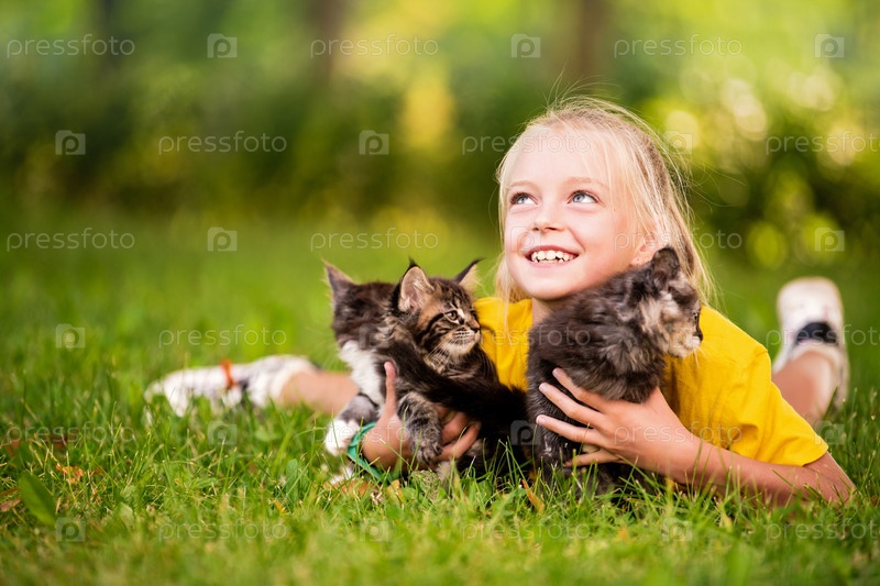Очаровательная маленькая девочка играет с маленькими котятами в теплый и солнечный летний день